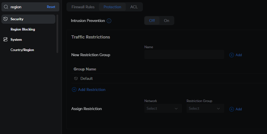 В UI больше нет возможности, насколько я понимаю, настроить/отключить блокировку по регионам, и при этом старая конфигурация всё ещё действует и вызывает проблемы, которые я хотел бы удалить навсегда. Я могу поискать настройки в UniFi UI и увидеть "Region Blocking" в результатах поиска. При нажатии на него я попадаю в Security -> Protection, где нет упоминания о блокировке по регионам. Только (отключено) Intrusion Prevention.
