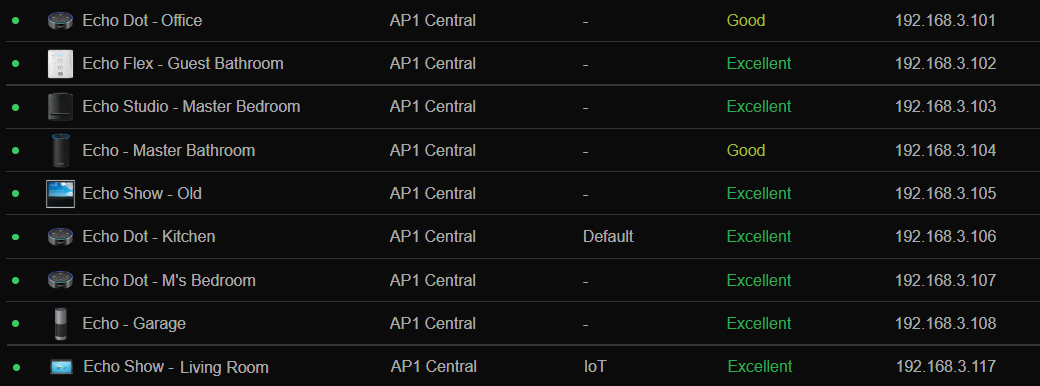 У меня настроен VLAN для IoT, и всё работает нормально, кроме того, что у многих устройств в этом VLAN неправильно показывается сеть — например, вместо Iot пишется Default, или сеть вообще не указана, просто «-». При этом все эти устройства имеют IP из VLAN (192.168.3.0/24), а не из Default (192.168.1.0/24). Например, это все устройства Amazon Echo, подключённые к VLAN через одну и ту же точку доступа. И всё равно у них указаны разные сети: