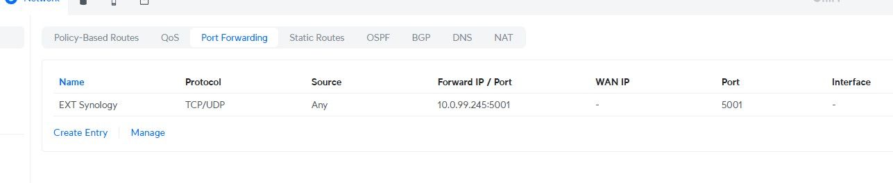 Пытаюсь получить доступ к моей Synology RS816 по внутренней сети из интернета через один из публичных IP-адресов, которые мне выделил провайдер. Это первое устройство, к которому я пытаюсь дать доступ извне, чтобы интегрировать его с M365 SSO. Мой основной публичный IP настроен, и дополнительные публичные IP-адреса сконфигурированы на WAN1.