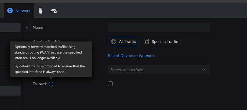 Настраивал Policy Based Routing, чтобы вся трафик из определённой сети выходил через (VPN-интерфейс, который я назвал) VPN1, и при настройке мне предлагают вариант "Fallback" на WAN1, если VPN1 станет недоступен. Почему нет возможности вручную выбрать, на что переключаться в случае сбоя? В моём случае я бы хотел, чтобы вся трафик выходил через VPN2, если VPN1 недоступен, а не через мой WAN. Кажется, этого невозможно сделать, и я не понимаю, почему нет такой опции. Можно было бы сделать это выпадающим списком, как и с полем прямо над ним.