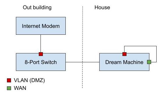 Мой интернет-кабель заходит во вспомогательное здание, где находится несколько клиентских машин. Моя "Мечта-машина" (Dream Machine) находится в доме. Хочу маршрутизировать интернет-соединение к "Мечта-машине", но при этом предоставить клиентам во вспомогательном здании (и в доме) доступ к интернет-соединению. Я попробовал настроить некоторые порты как отдельные (DMZ) VLAN. Подключил модем к VLAN во вспомогательном здании, а затем подключил порт на "Мечта-машине", также назначенный этой VLAN, к WAN-порту. У меня ЕДИНСТВЕННОЕ Ethernet-соединение между зданиями. Ноутбук, подключенный к этому DMZ-VLAN порту на "Мечта-машине", успешно получил IP-адрес от интернет-модема. Однако WAN-порт, подключенный к тому же порту, не получает IP-адрес от модема. Должна ли такая схема работать? Или есть альтернативный вариант? Большое спасибо.