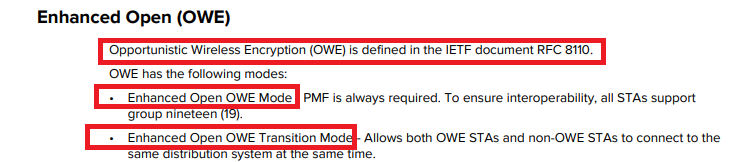 @UI-Team @UI-VP @UI-Glenn Я должен добавить эти выводы, в том числе по чипсету Mediatek MT7915 с полной сертификацией WiFi6, включая сертификат enhanced open: ЭТО ОЗНАЧАЕТ, ЧТО OWE и Enhanced Open (только) и также режим перехода Enhanced Open ДОЛЖНЫ быть полностью поддержаны. В этом внесли вклад и @chaicka, и я. Всем вам нужно кликнуть по картинкам, чтобы увидеть их в полном размере, или скачать, чтобы нормально рассмотреть всю информацию. Источник: https://www.wi-fi.org/download.php?file=/sites/default/files/private/202012_Wi-Fi_Security_Roadmap_and_WPA3_Updates.pdf А страницы, относящиеся к режимам OWE и Enhanced Open, это: страницы 9-11, 23, 30, 33.
