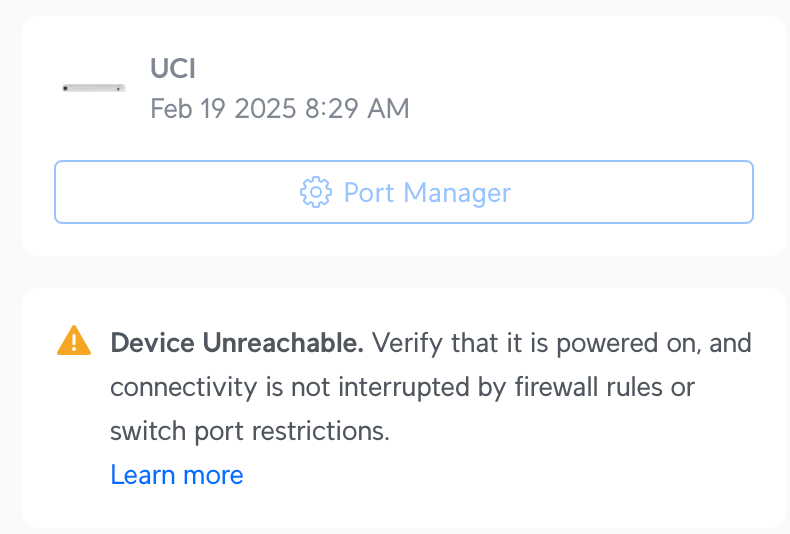 Сегодня получил свой новый UCI. Были проблемы с активацией у провайдера (они не хотели использовать MAC/серийный номер, так как такая информация уже есть в их системе (COX)). Устройство появилось в Unifi Network, и я его добавил. Теперь, когда всё настроено, устройство в системе отображается как офлайн. Нужно ли, чтобы оно было подключено к WAN 1 на UDM PRO SE, чтобы его обнаружили? Или просто удалить и добавить заново?