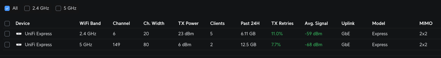 Я теперь совсем запутался... но Mac работает с максимальной производительностью, на которую я мог бы рассчитывать. Итак, последние настройки: 5 ГГц: Ширина 160, мощность передачи 192.4 ГГц: Ширина 20, мощность передачи 12