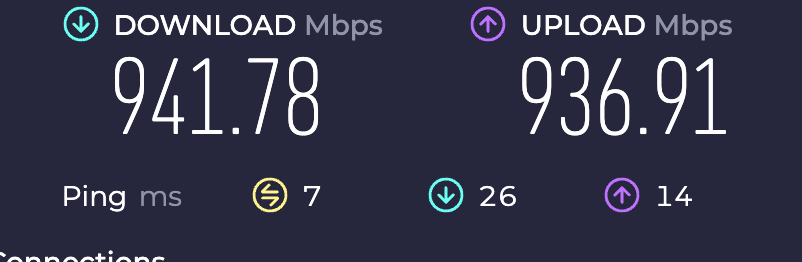 У меня 1Gbs оптоволоконное подключение, которое поступает в Express. Затем Express питает коммутатор. Проводная скорость на коммутаторе как и ожидалось около 950Mbps. Но находясь в пределах 4 метров от Express/AP по WiFi получаю следующее: