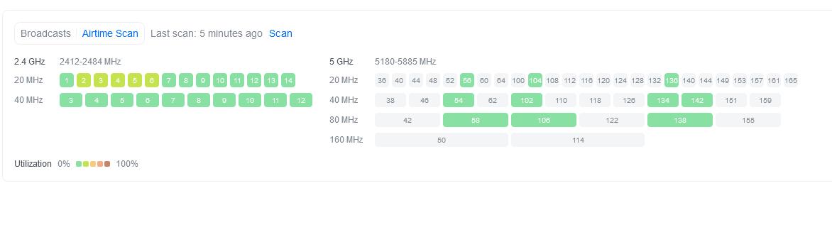 Запустил сканирование, и вот результат. Вижу легенду, которая показывает разные цвета. Темно-зеленый – 0% загруженности. Светло-зеленый – что-то большее… ну, скажем, 20%. А что насчет серых каналов на 5 ГГц?… Что значит "серый" цвет?… Я знаю, что они "доступны", потому что я ими пользуюсь. Собственно, это устройство установлено на CH 153. И оно серое здесь… так что же значит серый цвет?