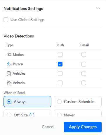У меня похожая проблема. Я использую два NVR, один настроен в режиме ребенка. Настройки уведомлений всегда возвращаются к «Глобальным настройкам», если камера назначена детскому NVR. Если я переношу камеру на родительский NVR, нужные изменения сохраняются.