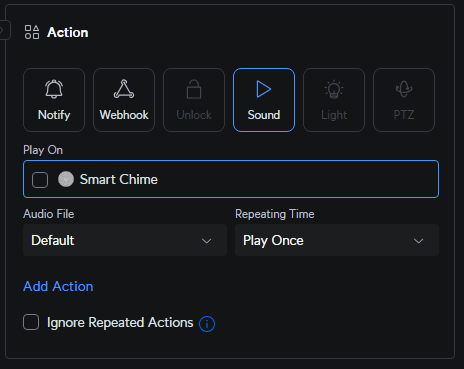 Заметил, что в настройках действий для менеджера оповещений есть опция 'Sound'. Можно ли настроить PoE Smart Chime, чтобы он активировался при обнаружении/тригере? У меня он выключен, возможно, потому что у меня нет чима, или это просто зарезервированное место для будущего оборудования? (Все эти штуки с сигнализацией и т.п.). Кто-нибудь знает?