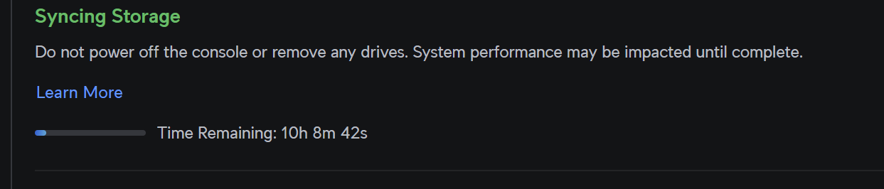 Привет! Я запускал 2 диска в UNAS во время перехода со старого NAS на новый. После этого я вставил ещё два диска такой же ёмкости, и оно зависло. Уже 24 часа показывает 10 часов 8 минут 42 секунды. У кого-нибудь есть советы, как быть? Спасибо!