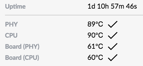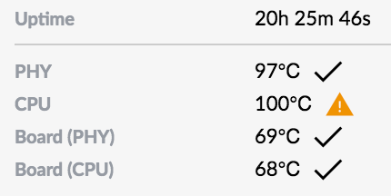 Та же проблема с CPU... PHY 96℃, CPU 106℃, плата (PHY) 71℃, плата (CPU) 68℃.