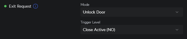 1. Для "Входного запроса выхода" на каждом терминале вашего EAH-8, измените уровень срабатывания "Exit Request" на "Закрыт активный (NO)", если "Входной запрос выхода" не используется для этой двери.