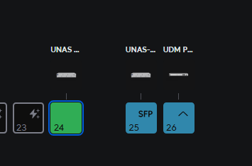 У меня UNAS-PRO подключен к USW-PRO Max 24 POE с обеими портами SSFP+ (25) и 2.5GbE (24):